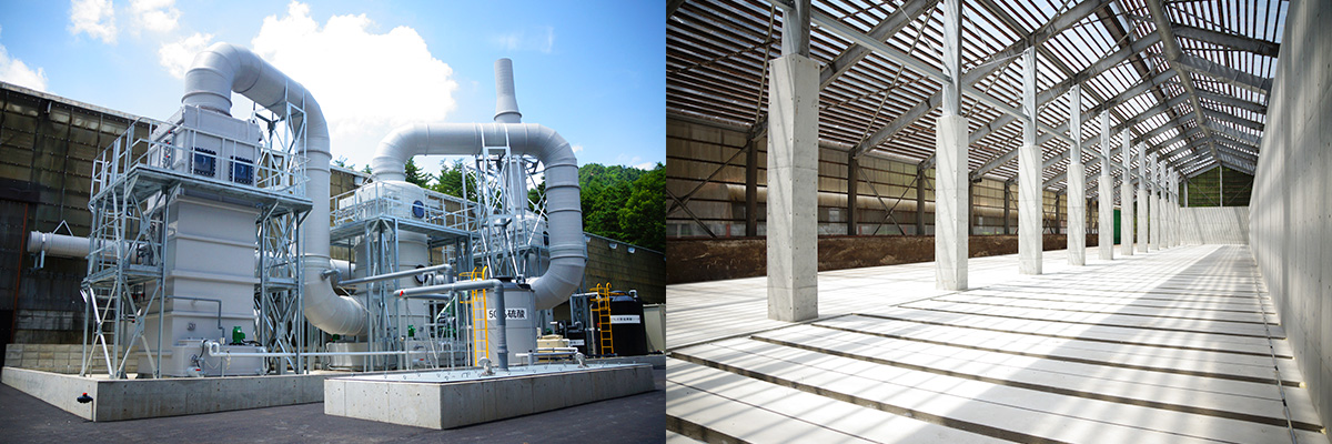 発酵促進設備に力を入れ、食品残渣等を良質な有機肥料しなのに変え、大地をリサイクルします。 大型脱臭装置を新たに導入し、地域・周辺施設への臭気対策への臭気対策に重点的に取り組んでいます。
